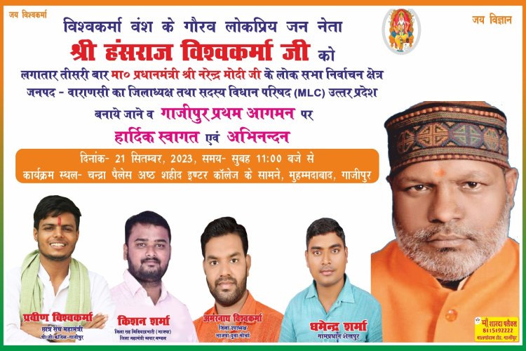 बहुत ही धैर्यवान, संयमी है।यह बात आज विश्वकर्मा समाज मुहम्मदाबाद के द्वारा आयोजित स्वागत अभिनन्दन समारोह में भारतीय जनता पार्टी वाराणसी के लगातार तीसरी बार अध्यक्ष चुने गए विधान परिषद सदस्य हंसराज विश्वकर्मा ने मुहम्मदाबाद के चंद्रा पैलेस में अभिनन्दन समारोह में कही। उन्होंने कहा कि हमारा देश बहुत दिनों तक गुलामी की जंजीरों से जकड़ा रहा आजादी के बाद की सरकारों के पास देश के विकास और सम्मान समृद्धि कि कोई सोच और योजना नहीं थी। जिसके परिणामस्वरूप हमें उन समस्याओं से आज भी संघर्ष करना पड़ रहा है जो हमारी थी ही नहीं, पुर्ववर्ती सरकारों द्वारा राजनीति के तहत उसे उलझा कर रखा गया। उन्होंने कहा कि देश के मजबुती और समृद्धि के लिए भारतीय जनता पार्टी लगातार काम कर रही है।देश की जो समस्याएं जड़ हो चुकी थी,आज वह जड़ से समाप्त हो रही है। प्रधानमंत्री नरेन्द्र मोदी और मुख्यमंत्री योगी आदित्यनाथ के नेतृत्व मे देश से ग़रीबी और भ्रष्टाचार समाप्त हो रहा है। उन्होंने कहा कि प्रधानमंत्री विश्वकर्मा योजना के माध्यम से समाज के असंगठित लोगों की गरिबी ही नहीं बल्कि समाजिक सम्मान भी मजबूत होगा।उन्होंने समाज के लोगों से आह्वान किया कि हर समस्याओं का सामना करिए लेकिन अपने बच्चों को उच्च शिक्षा के लिए प्रेरित करिए उन्हें शिक्षित करिए। उन्होंने आह्वान किया की सामाजिक कार्यों में सदैव सहयोगी रहिए, इससे आपका और समाज का भला होगा इससे समाज को मजबूती मिलेगी।