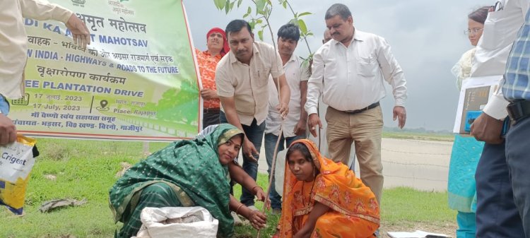 गाज़ीपुर बिरनो । एनएचआई यूपीएसआरएलएम से अनुबंध के क्रम में सरायबंदी से लेकर मटेहु तक वाराणसी गोरखपुर फोरलेन के दोनों तरफ वृक्षारोपण का कार्य समूह के माध्यम से किया जाना है इसी क्रम में आज आजादी के अमृत महोत्सव 2.0 के क्रम में मां वैष्णो स्वयं सहायता समूह राजापुर भड़सर की अध्यक्ष रीमा चौरसिया उपायुक्त स्वरोजगार गोपाल कृष्ण चौधरी के हाथों से आज वृक्षारोपण कार्य का शुभारंभ किया गया इस अवसर पर रीमा चौरसिया ने बताया कि पर्यावरण हमारे जीवन का एक अभिन्न अंग है पेड़ पौधे हमारे जीवन जीने का उद्देश्य बनते हैं पेड़ों को लगाने मात्र से हमारे उद्देश्य की पूर्ति नहीं हो सकती बल्कि हमें पेड़ पौधों