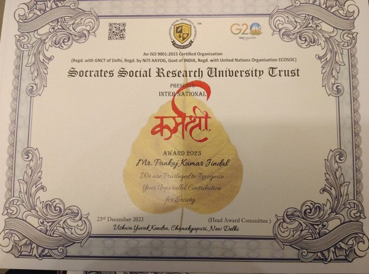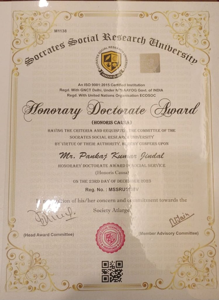 नोएडा के प्रतिष्ठित व्यवसायी एव समाजसेवी पंकज जिंदल को सोक्रेट्स सोशल रिसर्च यूनिवर्सिटी ने उनके जीवनपर्यंत उत्कृष्ट सामाजिक कार्यों के लिए मानद डॉक्टरेट की उपाधि से किया गया सम्मानित। यह उपाधि एनसीईआरटी के संयुक्त निदेशक डॉ नाहर सिंह ने प्रधान की, इसी के साथ उन्हें अंतरराष्ट्रीय कर्मश्री अवार्ड से भी नवाजा गया।
