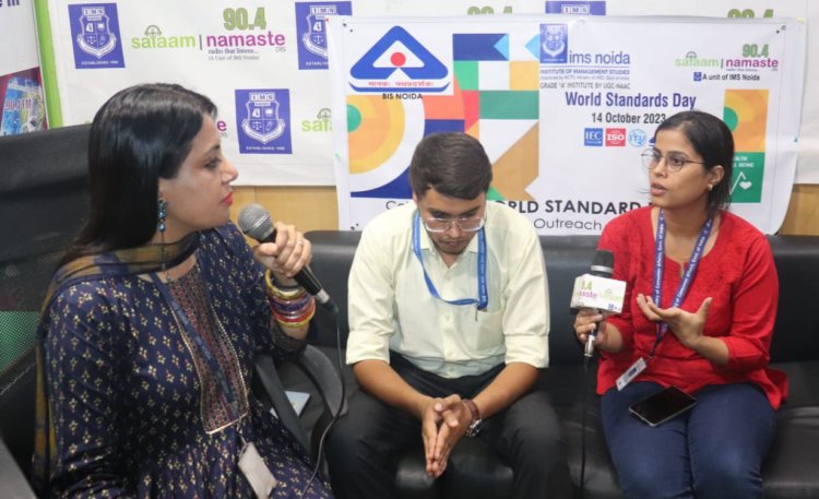 नोएडा। आईएमएस नोएडा के सामुदायिक रेडियो सलाम नमस्ते में विश्व मानक दिवस पर कार्यक्रम का आयोजन हुआ। बृहस्पतिवार को सेक्टर 62 स्थित संस्थान परिसर में कार्यक्रम के दौरान बतौर अतिथि ब्यूरो ऑफ इंडियन स्टैण्डर्ड (बीआईएस), नोएडा के ग्रेजुएट इंजीनियर जागृति तिवारी ने अपनी उपस्थिति दर्ज करायी। वहीं कार्यक्रम के दौरान भारतीय मानकों एवं उपभोक्ता संरक्षण पर जागरूकता का आयोजन हुआ।